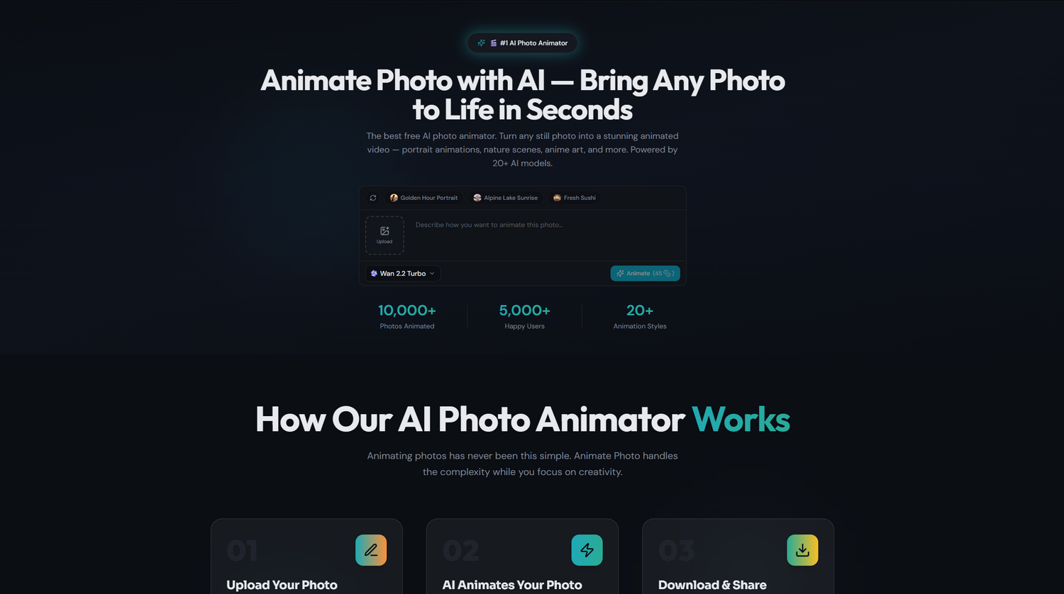 Animate Photo is the premier AI-powered platform designed to effortlessly transform your static images into captivating, lifelike animations. As the #1 AI photo animator, it empowers anyone to breathe dynamic motion into any photograph within seconds. Whether you have a cherished portrait, a breathtaking landscape, a piece of digital art, or an anime illustration, this advanced tool uses sophisticated artificial intelligence to interpret and animate the scene, adding subtle, realistic movement that brings the moment back to life.