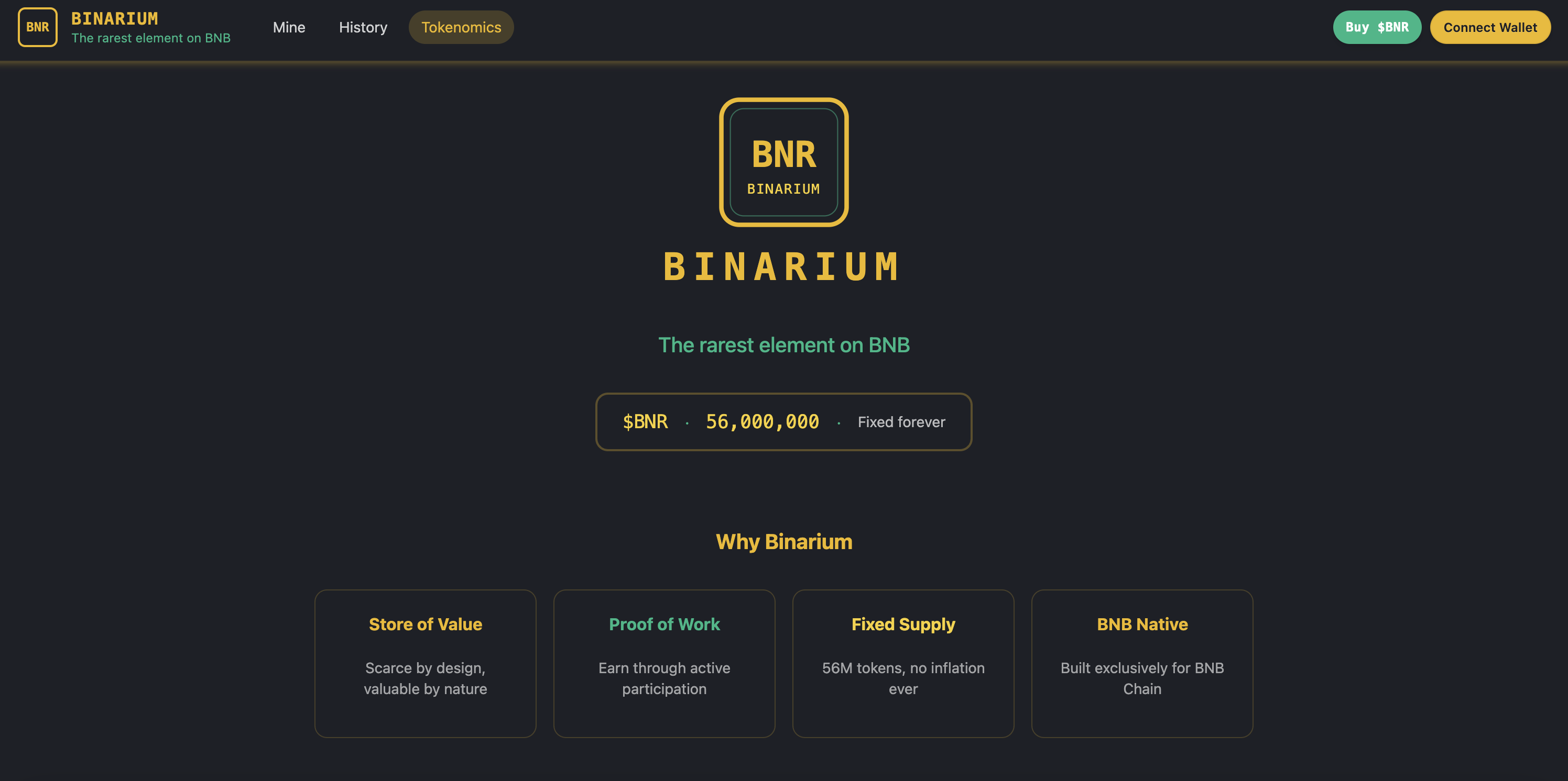 Binarium ($BNR) presents itself as the definitive store of value on the BNB Chain, conceptualized as the rarest elemental resource within its ecosystem. More than just a token, it is positioned as a scarce digital asset, akin to a precious metal or rare earth element discovered in the depths of a blockchain mine. The project centers around a unique mining mechanism where users can deploy resources to extract $BNR, with the promise of uncovering a "Motherlode" of this coveted element. This interactive process invites participants to engage directly with the token's generation, fostering a community-driven approach to acquiring and valuing $BNR.