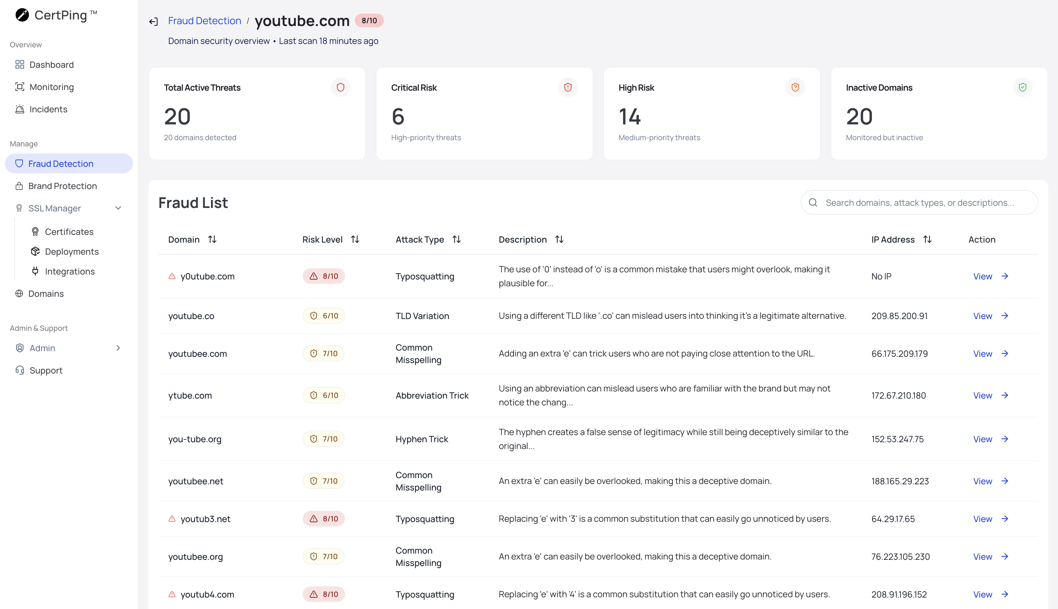Beyond SSL, Certping actively safeguards your brand's digital territory. It continuously scans for domain name infringements, typosquatting attempts, and fraudulent websites that aim to impersonate your brand. This proactive monitoring extends to trademark violations across digital spaces, providing early detection of phishing campaigns and brand abuse that could damage customer trust and lead to significant financial loss. By identifying these threats early, Certping empowers your legal and security teams to take swift action before any real harm occurs.