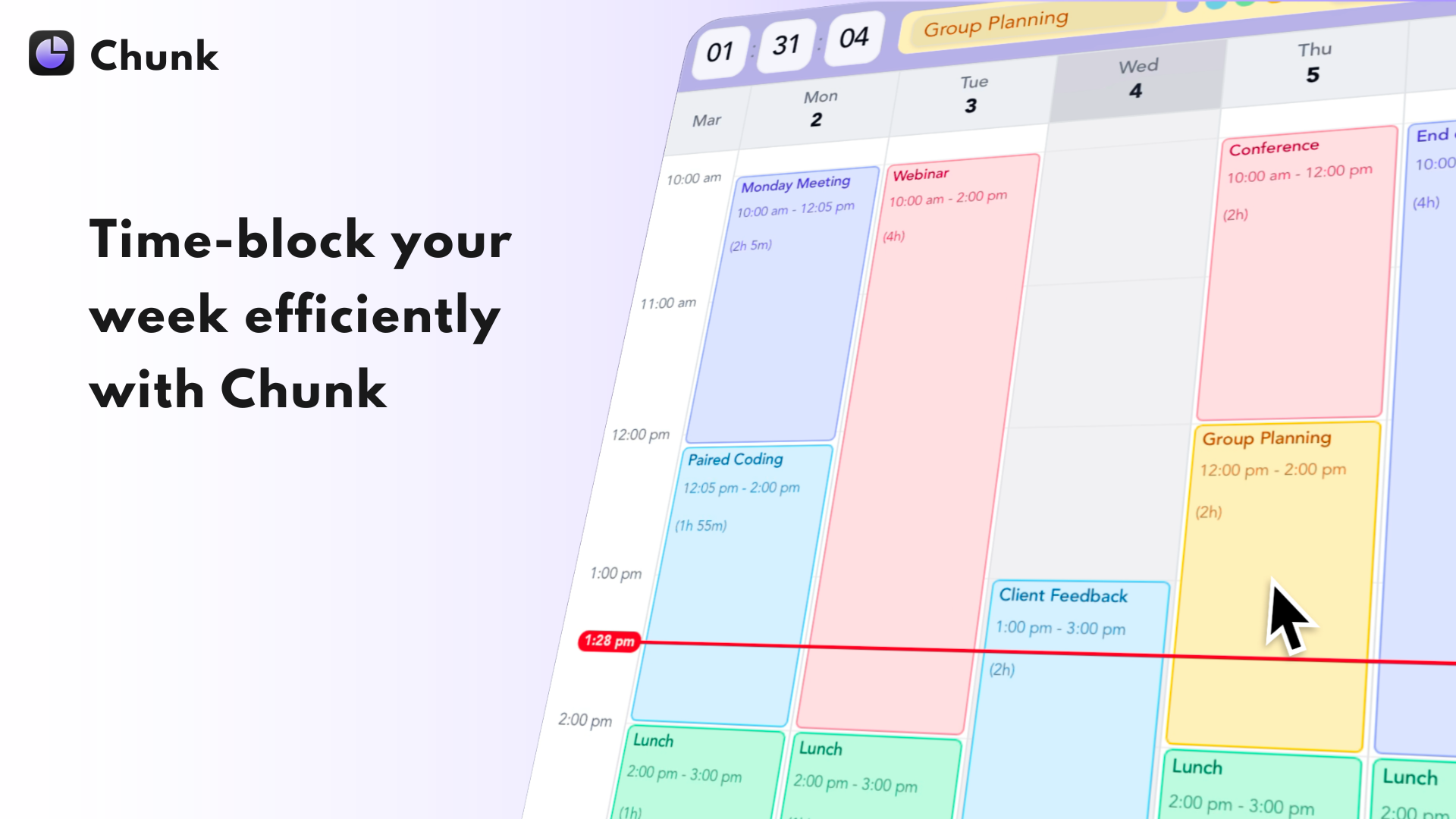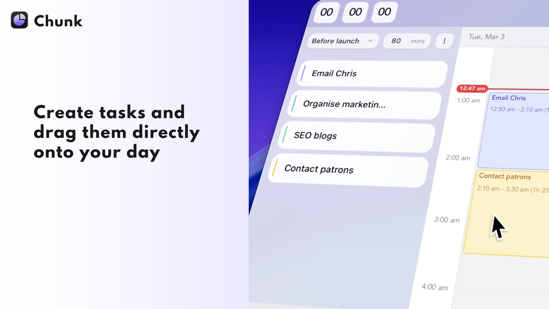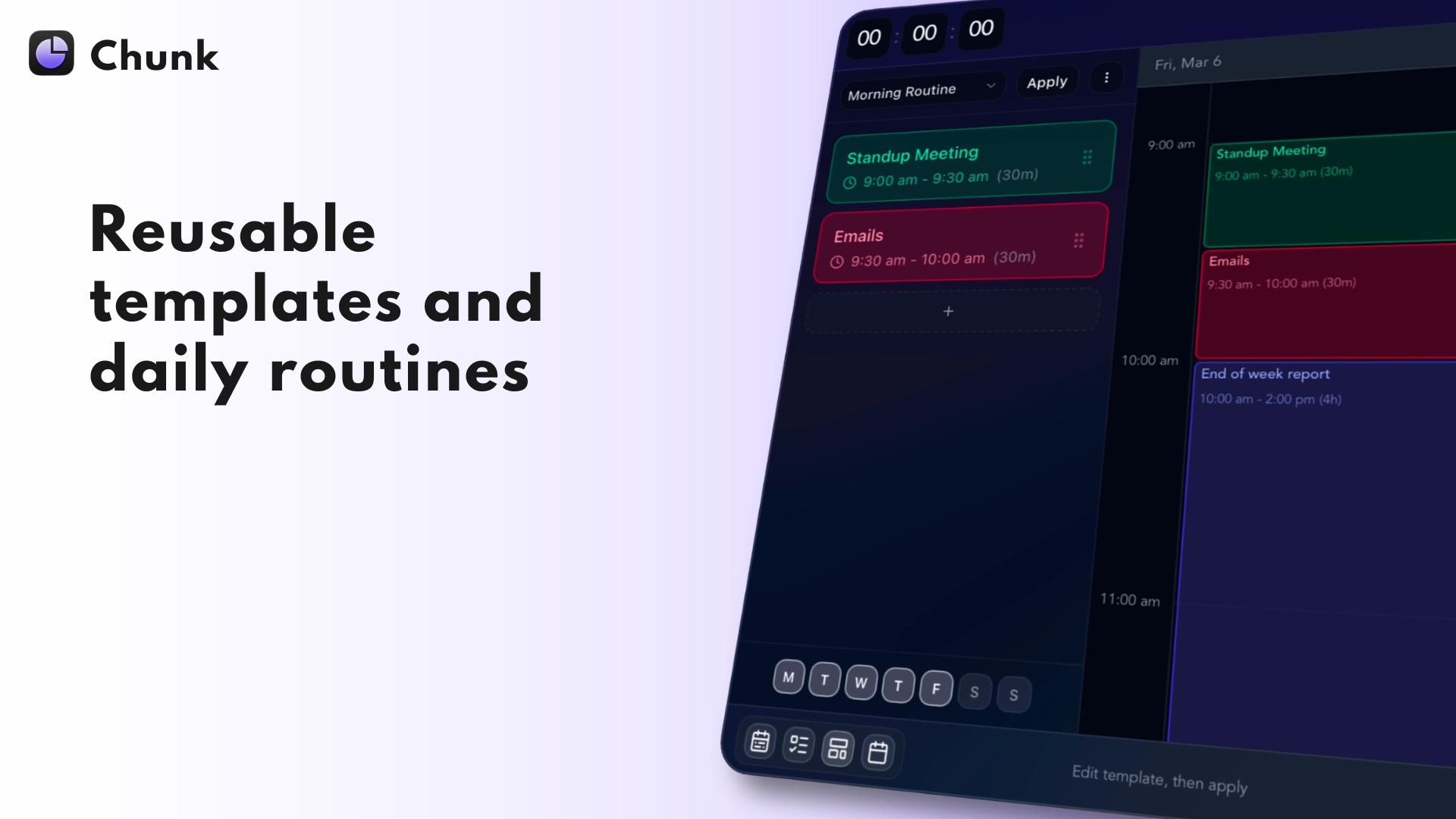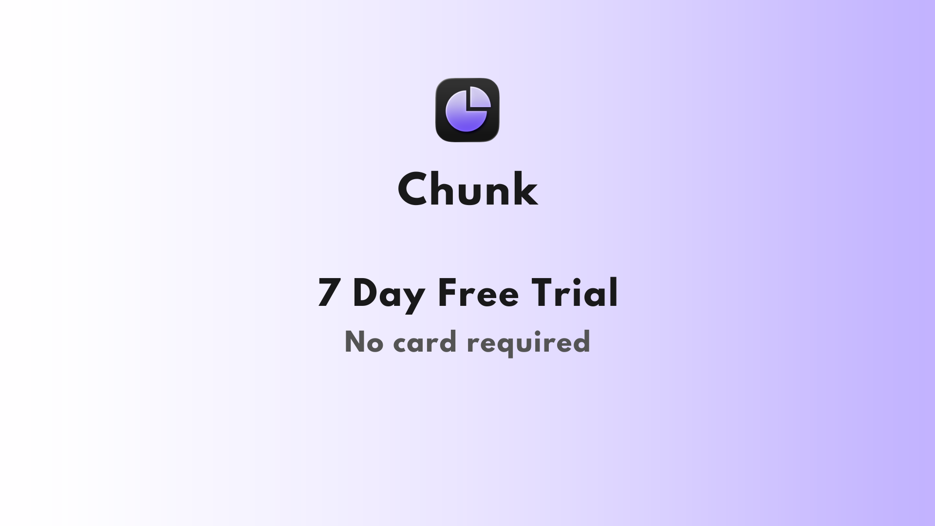 We built Chunk because we kept bouncing between calendars, notes, and a dozen other apps just to stay on track for the day. What we actually wanted was something dead simple: a way to break the day into focused chunks of time, always one shortcut away, never breaking your flow.