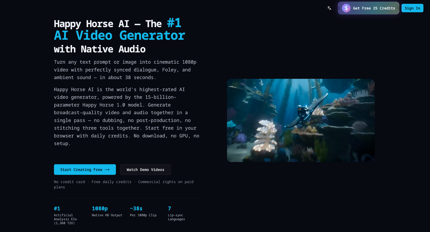 Happy Horse AI stands as the premier AI video generator, revolutionizing content creation by transforming simple text prompts or static images into fully-realized, cinematic 1080p videos in approximately 38 seconds. It is distinguished as the world's highest-rated tool of its kind, powered by the proprietary and formidable 15-billion-parameter Happy Horse 1.0 model. This technology achieves what others cannot: generating broadcast-quality video and native, perfectly synced audio in a single, seamless pass. This eliminates the traditional, tedious workflows of separate dubbing, sound editing, and post-production stitching, delivering a complete audiovisual narrative directly from your imagination.