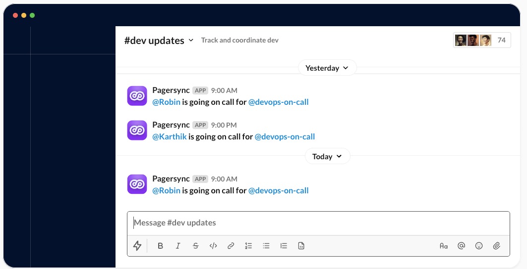 🛡️ **Reliable Escalations:** Supports complex schedules and escalation policies, ensuring that even during shift rotations or handovers, the Slack group points to the right individual for accountability.