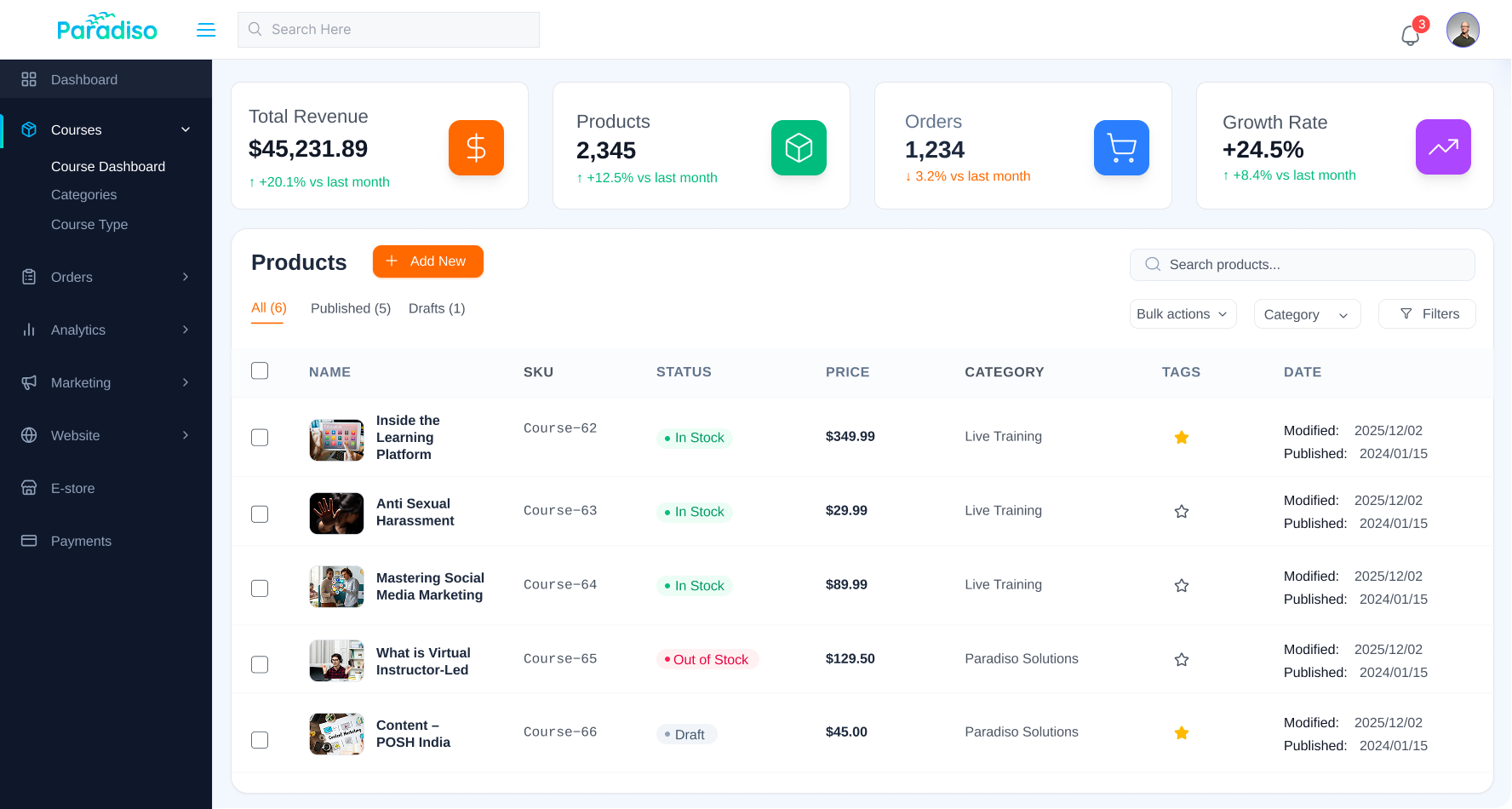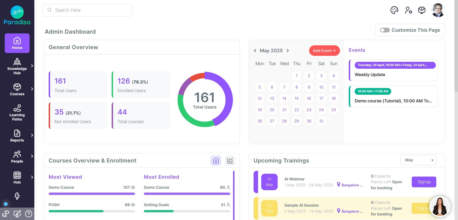 Built with a highly modular and customizable architecture, Paradiso LMS allows enterprises to tailor the platform to their specific training requirements, branding, workflows, and user experiences. From employee training and compliance to partner enablement and customer education, Paradiso LMS provides a flexible and scalable foundation for enterprise learning.