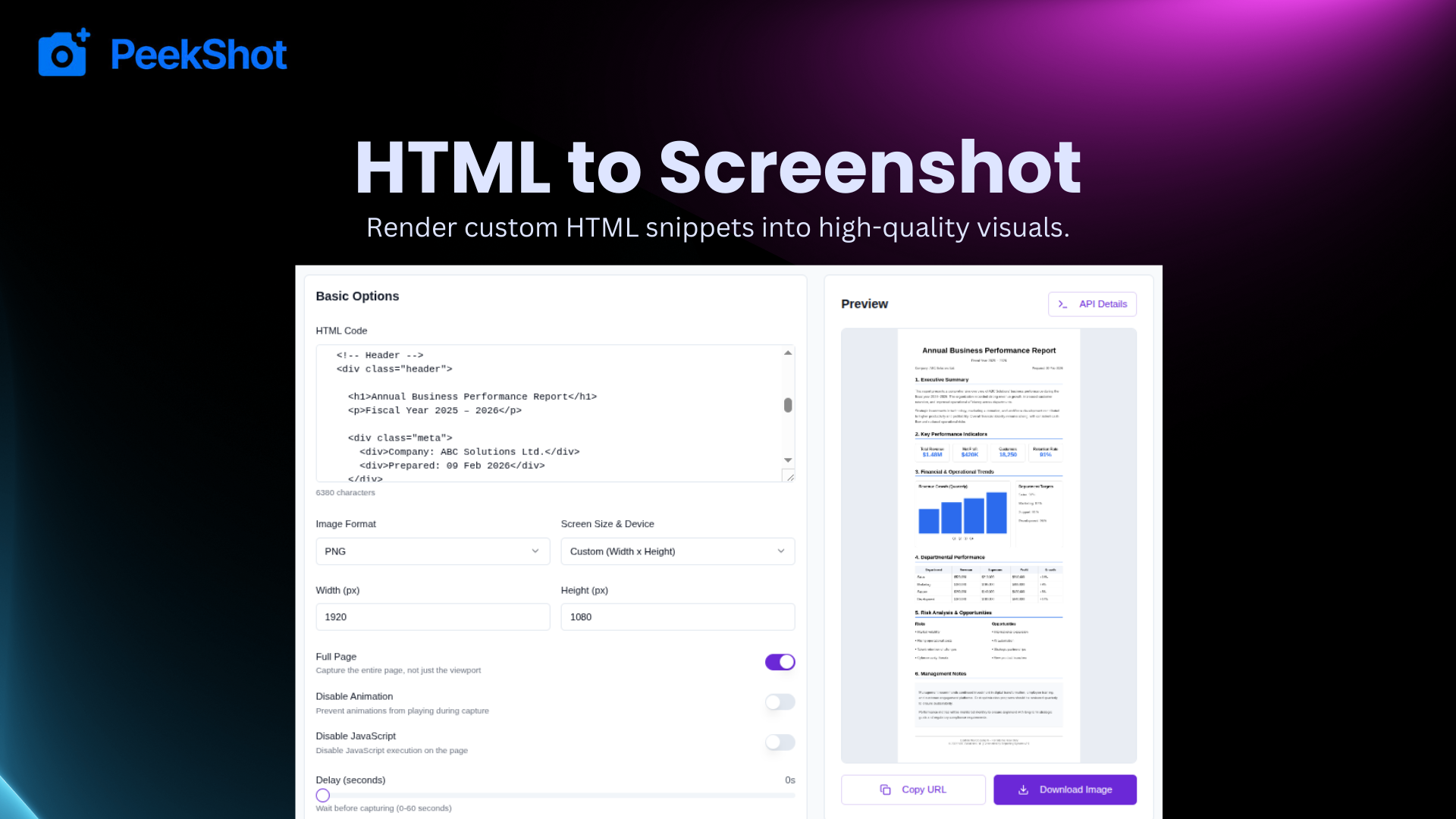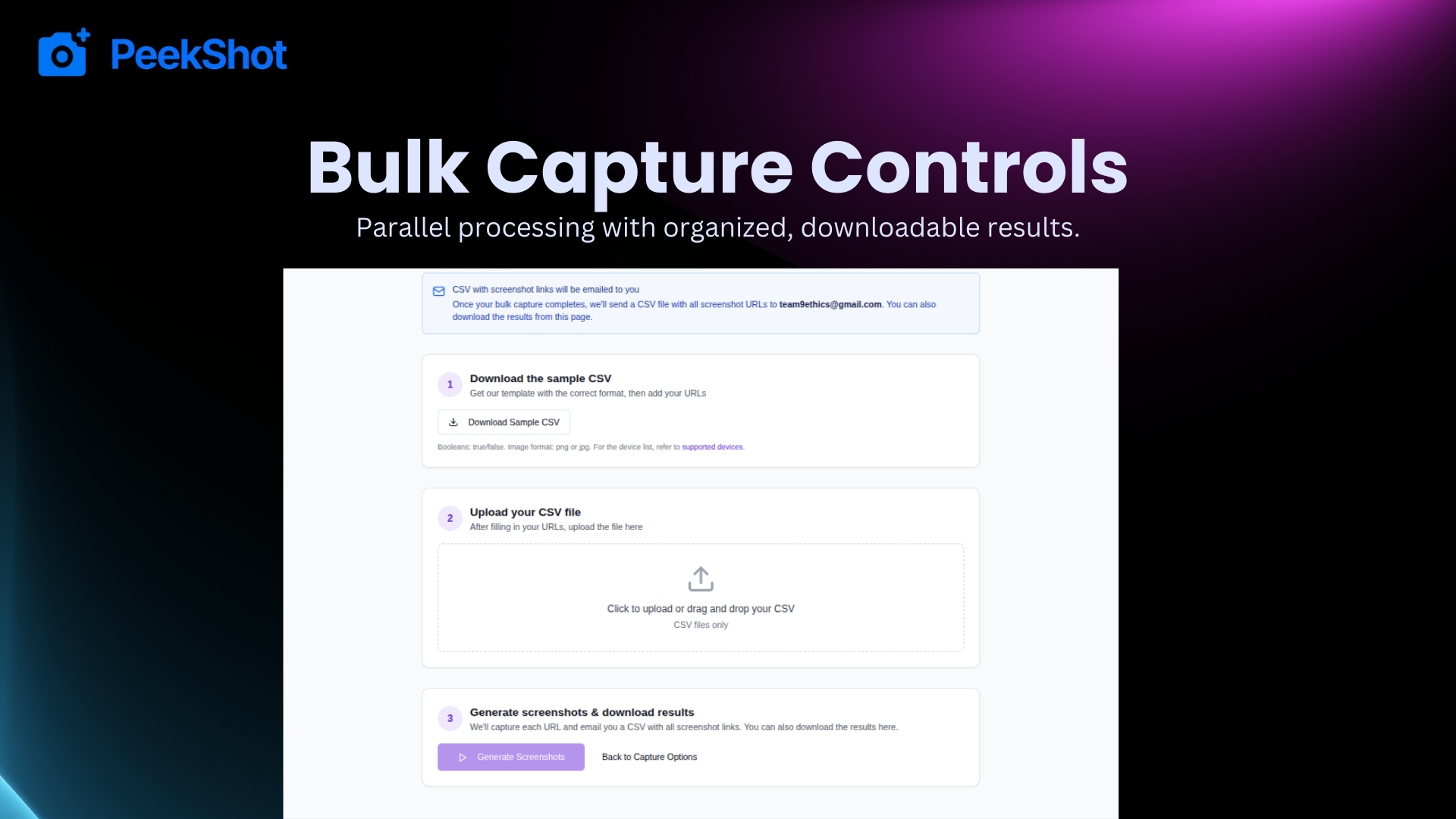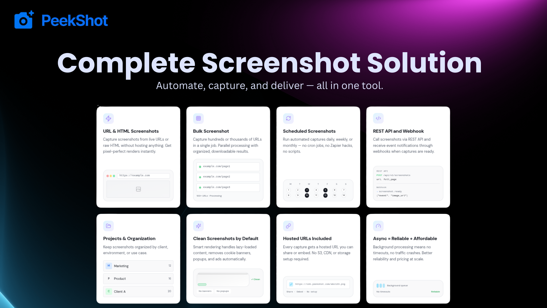 PeekShot is the definitive solution for anyone who needs reliable, high-quality website screenshots without the operational overhead. It empowers marketing teams, developers, QA testers, and agencies to focus on their core work while automating a vital but tedious digital task.