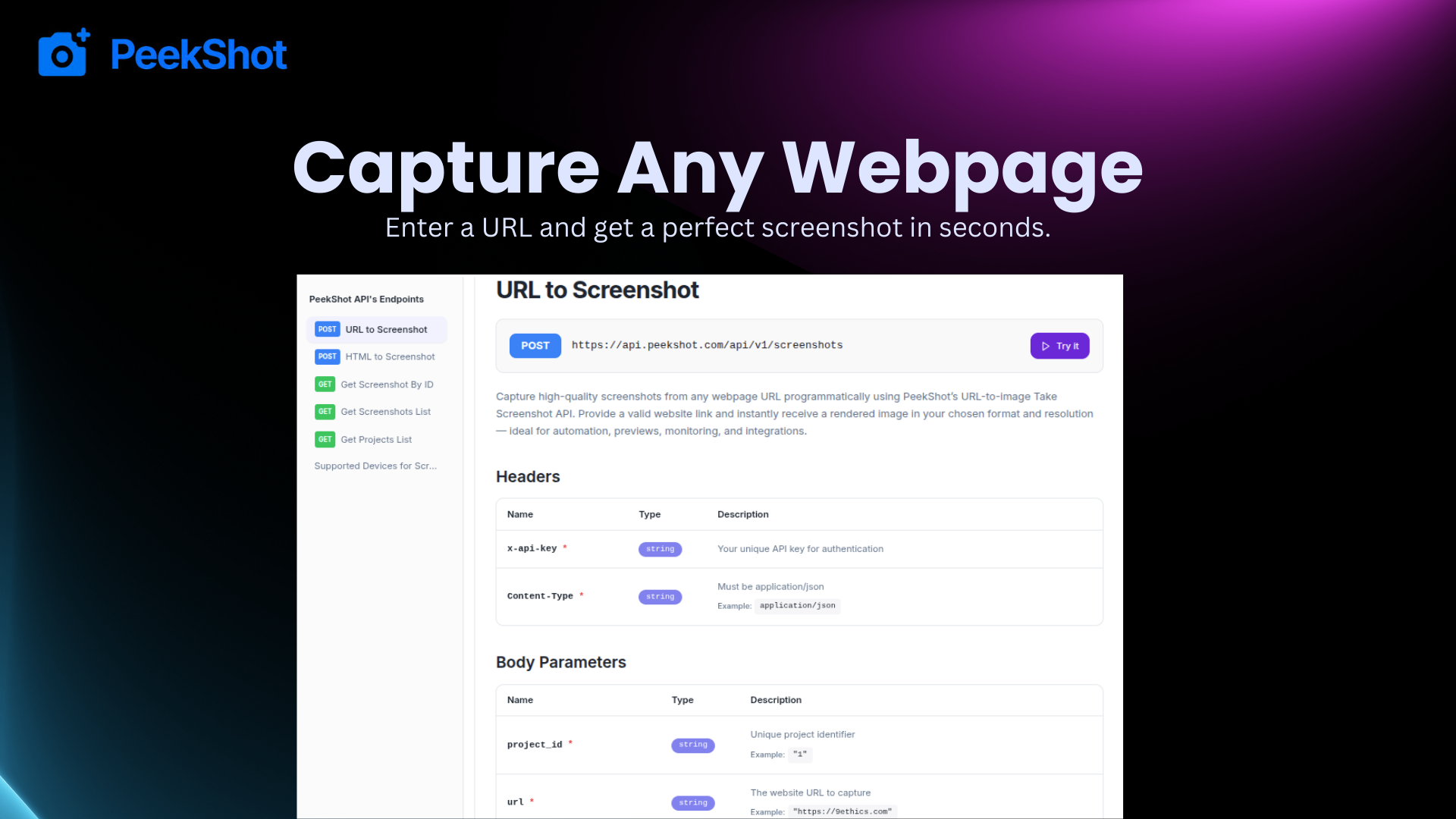 🔧 Powerful API & Integration: Seamlessly embed automated screenshot functionality into your own applications, dashboards, or workflows with comprehensive developer documentation.