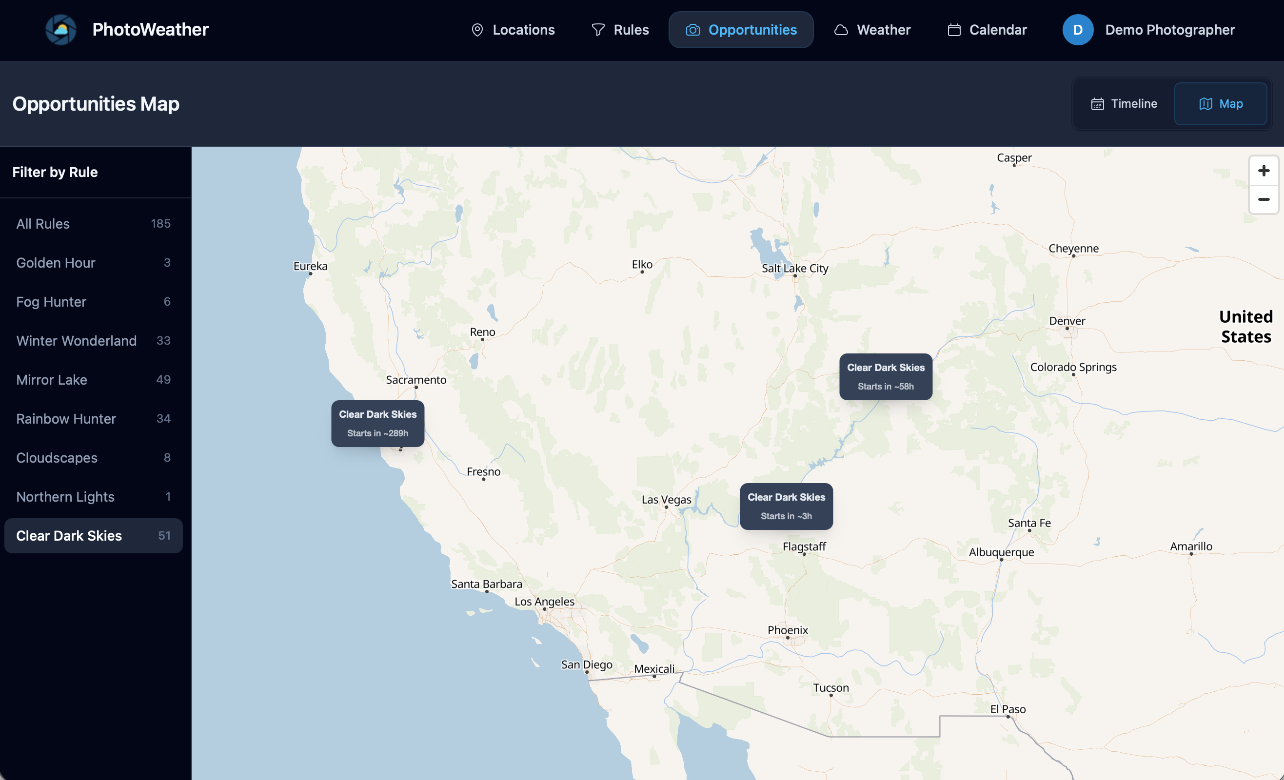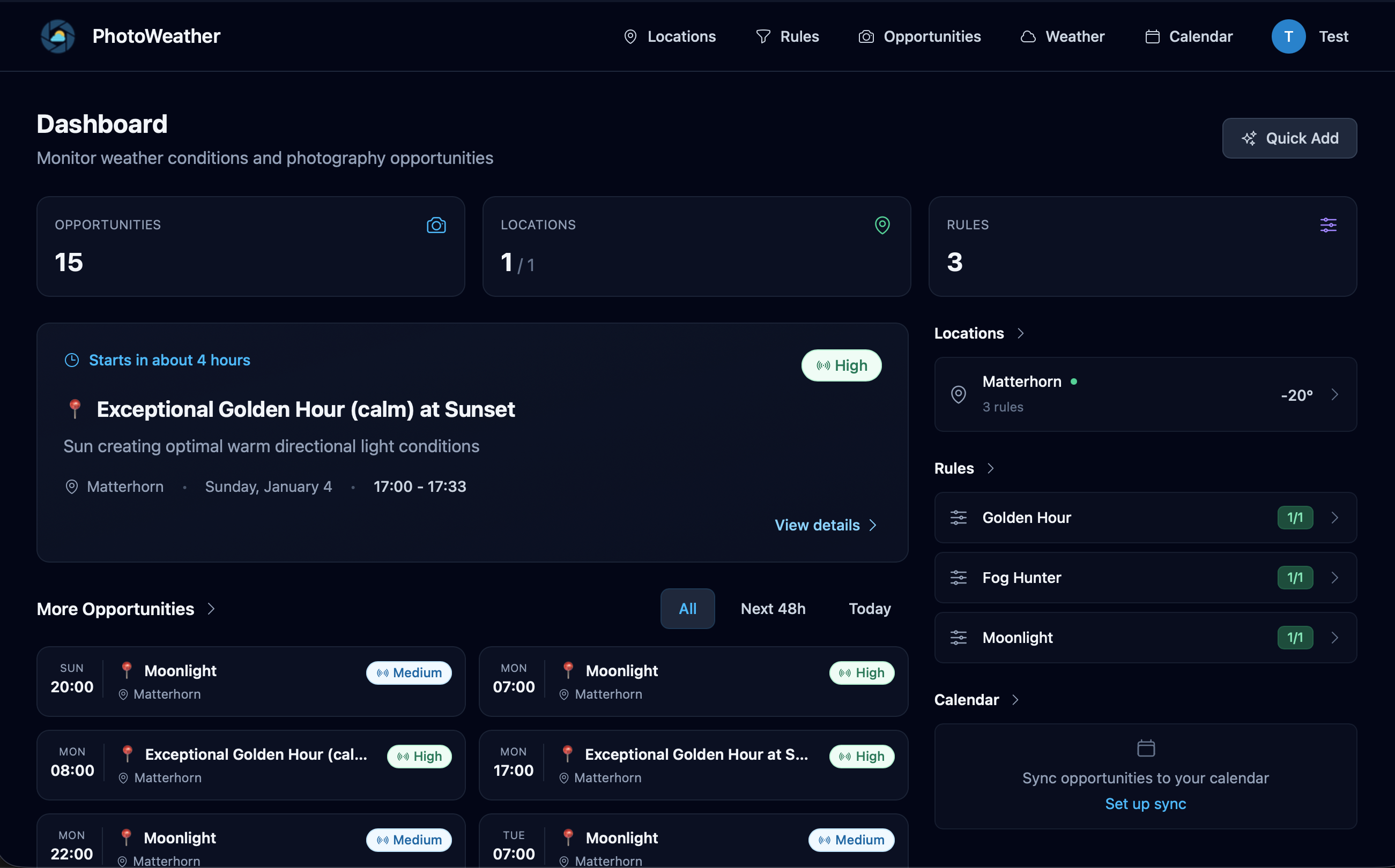 How it works: add locations → create rules (or pick templates) → get alerts with confidence scores and how long the window lasts. Built for photographers: fog/mist, golden & blue hour potential, aurora (activity + viewing conditions), storm intensity, coastal drama (waves + atmosphere), and more.