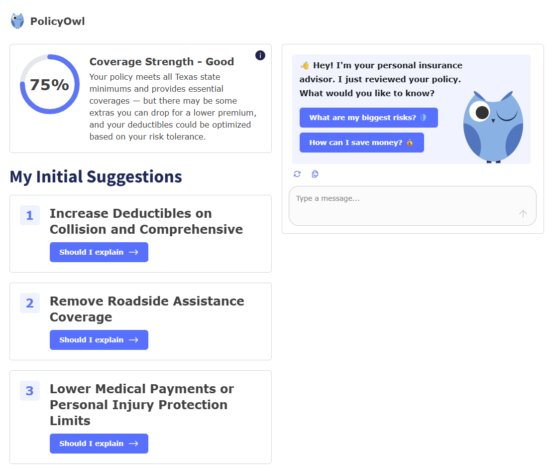 Whether you’re reviewing a new policy, preparing for renewal, or just want peace of mind, PolicyOwl gives you a smarter way to audit your insurance — powered by AI, built for consumers.