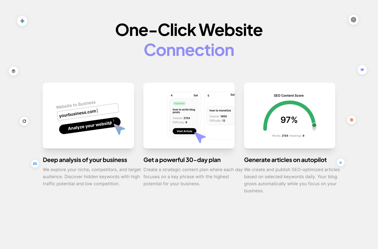✨ AI-Driven Content: Get blog posts recommended by advanced AI and optimized to rank on Google.