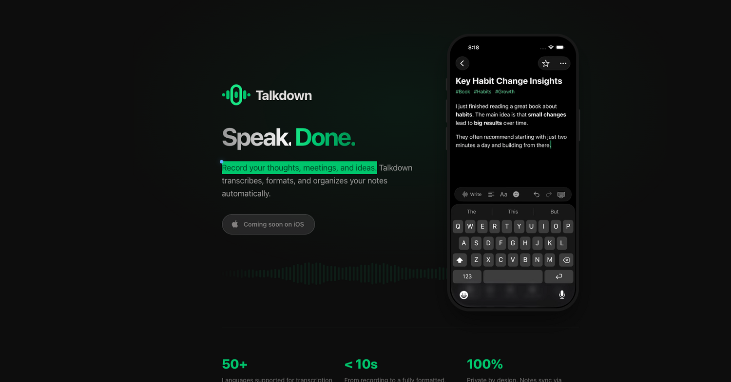 Talkdown is the intelligent voice note-taker that transforms your spoken words into perfectly formatted text. Designed for the thinker on the move, it captures your spontaneous ideas, crucial meeting details, and daily reflections, then does the heavy lifting of organization for you. Simply speak your mind, and watch as Talkdown creates a structured, readable note in less than ten seconds, complete with a smart title and logical categorization.