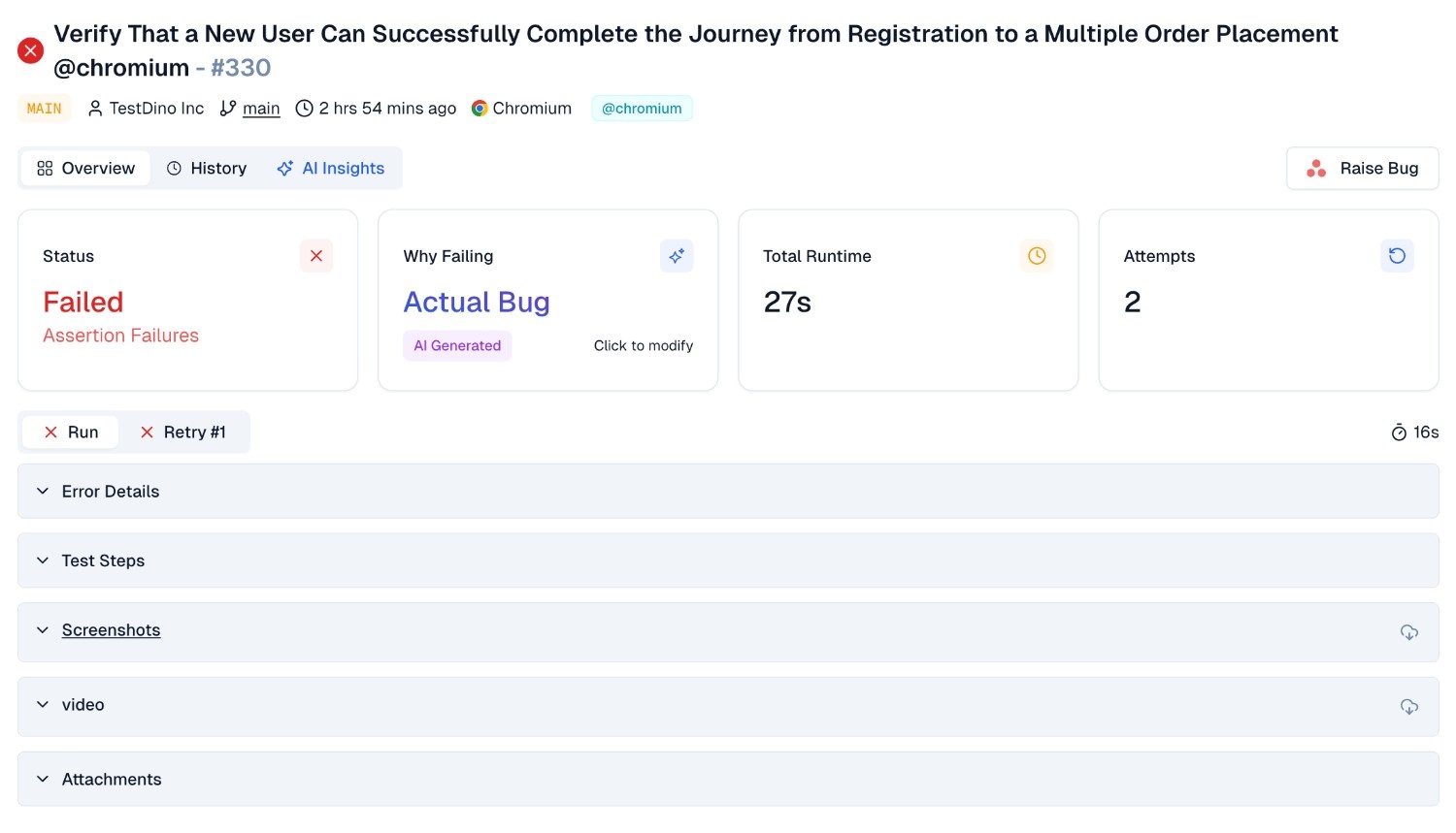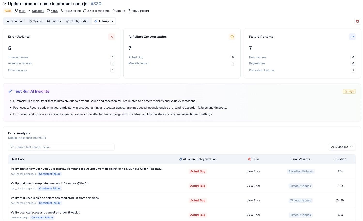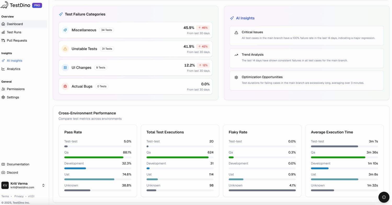 Every test run comes with AI-driven failure classification with a confidence score and recommended fix.