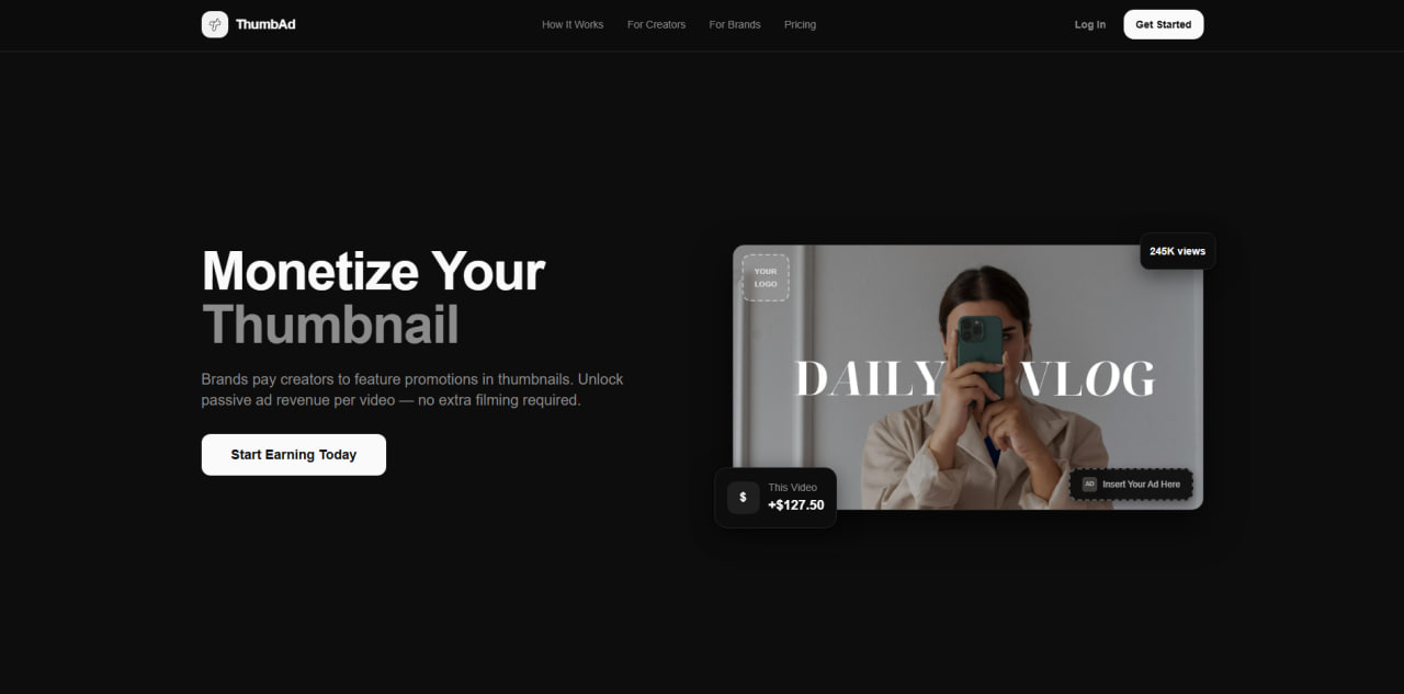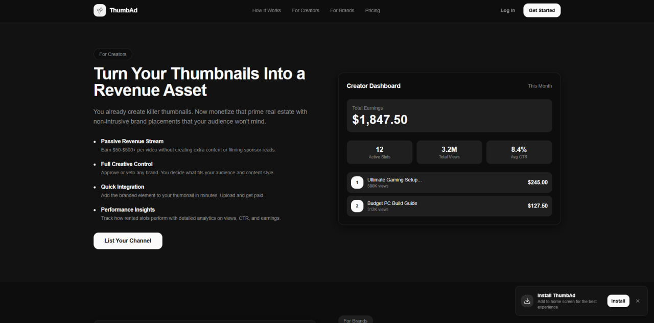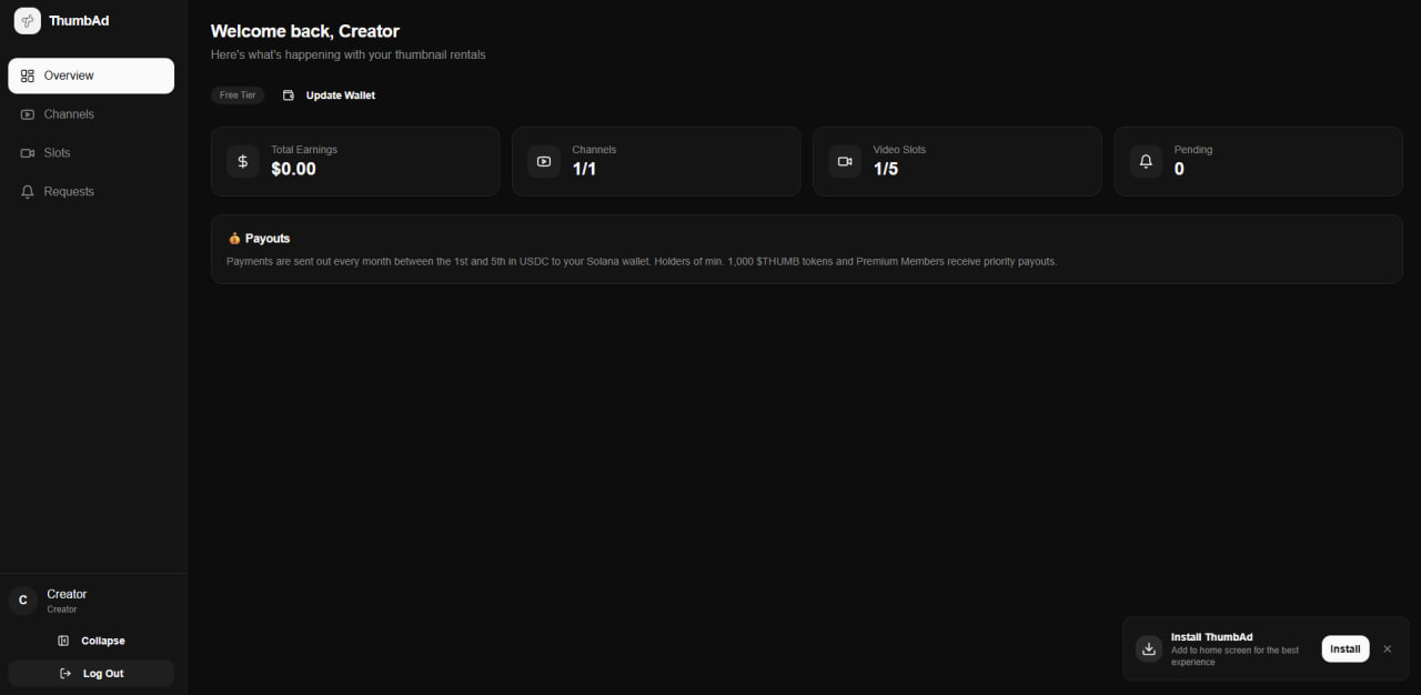 Creator earnings were lagging a bit, so we decided to give them a push. Own your channel, own your videos, and own your thumbnails. Your thumbnail is now a rental property thanks to ThumbAd. Rent it. Monetize it.
