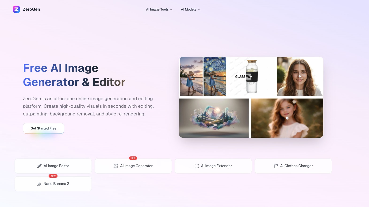 ZeroGen distinguishes itself through its all-in-one approach, eliminating the need to juggle multiple applications. The platform is built around a powerful AI image generator that can materialize virtually any concept from a text description. Beyond simple generation, ZeroGen provides sophisticated tools to perfect and transform your images. This includes intelligent outpainting to extend image borders, precise background removal for clean cut-outs, and advanced re-rendering to apply new artistic effects to existing photos.